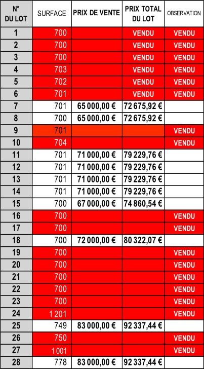 | N° DU LOT | SURFACE | PRIX DE VENTE | PRIX TOTAL (frais inclus) | OBSERVATION |